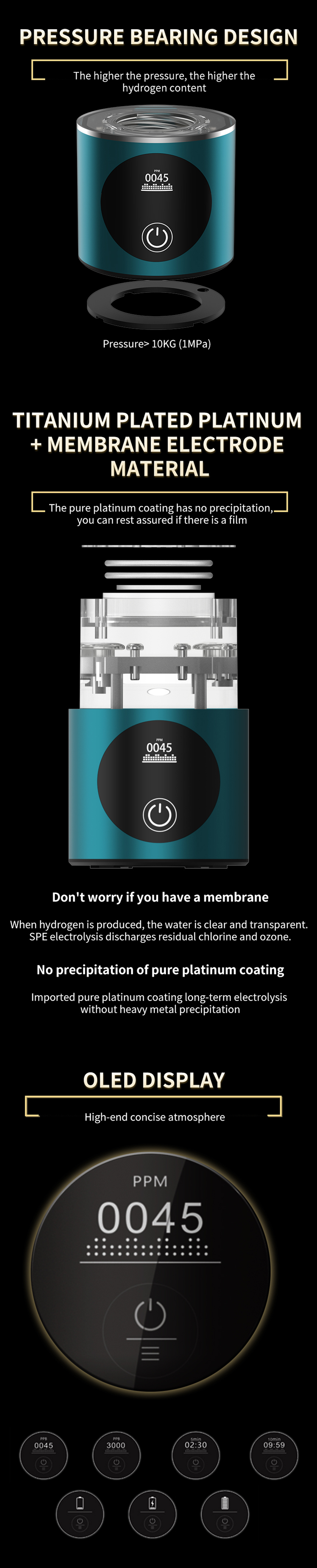 - Висока производителност на водород под налягане - до и над 3000 ppb. Под налягане при работа с бутилка от минерална вода генераторът може да достигне концентрация на водород до 5000 ppb.