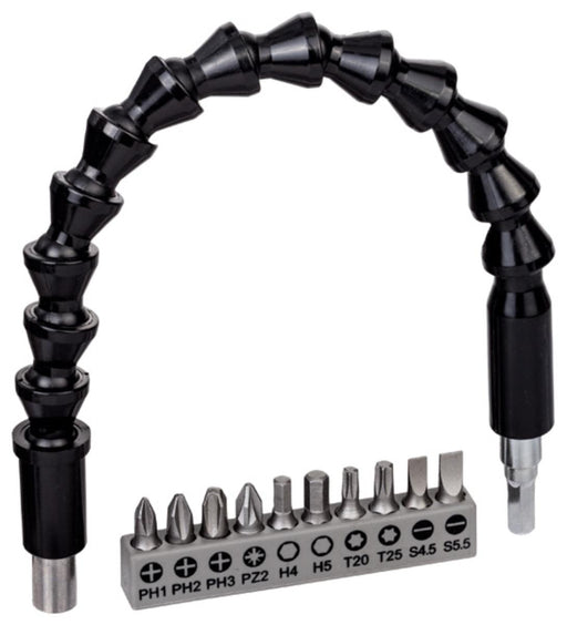 BoschВ наличностКомплект накрайници от 11 части с гъвкав удължеител от пластмаса. Дължина: 300 mm 10 бита: PH1, Ph2, Ph3, PZ2, Hex4, Hex5, T20, T25, SL 0.6x4.5, SL...