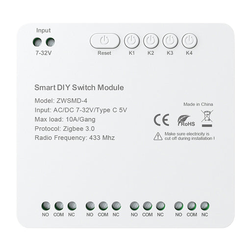 Avattoin stockZigBee 4-канален комутационен модул с безнапреженов контакт DC 32V Avatto ZWSMMD-4-250V. Avatto ZWSMMD-4-250V е 4-канален ZigBee комутационен модул...
