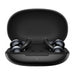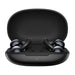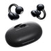Black OpenRock earphones floating above a charging case on a bright background